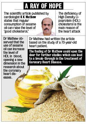 The scientific article -- prepared after 11 years of study -- published by cardiologist K K Mathew in the official publication of Cardiological Society of India’s Kerala Chapter, states that regular consumption of sesame oil can raise the level of ‘good cholesterol.’