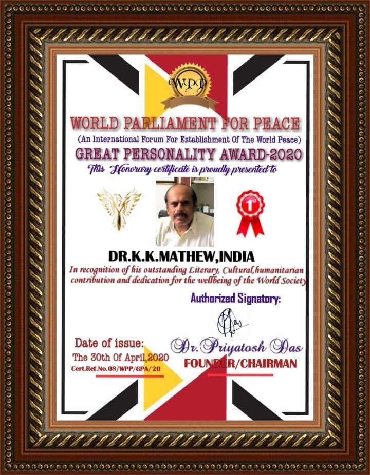 Dr. K. K. Mathew was conferred GREAT PERSONALITY INTERNATIONAL AWARD-2020 in May 2020 by World Parliament for Peace.