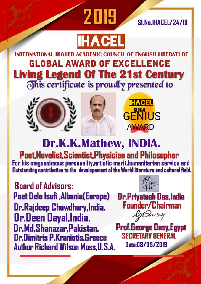 International Higher Academic Council of English Literature conferred Dr.Mathew with the global award of excellence " Living Legend Of The 21st Century" on 8th May 2019