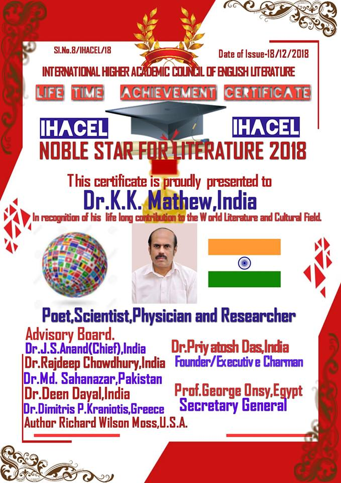The International Institution International Higher Academic Council Of English Literature Awarded Dr. K. K Mathew With The Honor 'nobel Star For Literature 2018'