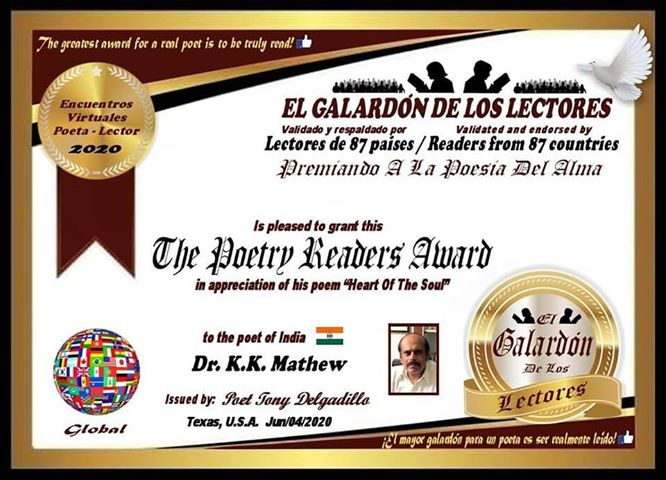 Readers from 87 countries selected Dr. Mathew's poem HEART OF THE SOUL as the best poem in June 2020. He was given THE POETRY READER'S AWARD
