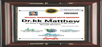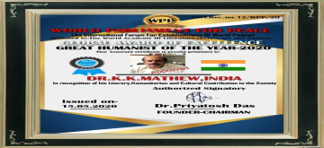 Dr. K. K. Mathew was conferred GREAT PERSONALITY INTERNATIONAL AWARD-2020 in May 2020 by World Parliament for Peace. &nbs